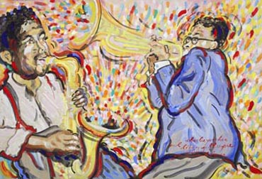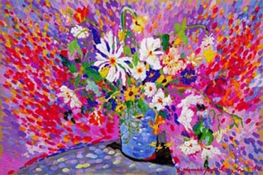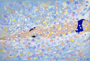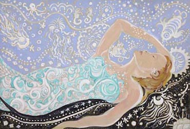 A true romantic, Brown adds elements of fantasy, music and mermaids, flowers and fairies to his lyric paintings. His paintings begin with a pencil under-drawing. This linear plan sets the format of the general composition. Color is then added to enrich, flesh-out and give life to the initial sketch. These vibrant colors are applied with a variety of strokes that vary from short daubs to long threads of paint. The resulting texture of color appears like a rich tapestry.