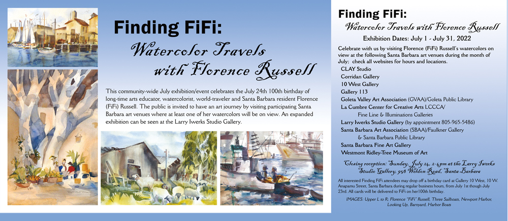 This community-wide July exhibition/event celebrates the July 24th 100th birthday of long-time arts educator, watercolorist, world-traveler and Santa Barbara resident Florence (FiFi) Russell. The public is invited to have an art journey by visiting participating Santa Barbara art venues where at least one of her watercolors will be on view. An expanded exhibition can be seen at the Larry Iwerks Studio Gallery.