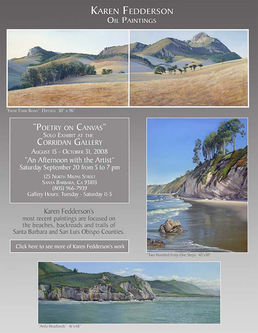 Called “Poetry on Canvas”, Karen Fedderson’s contemporary oil paintings, celebrate the beauty of the California coastal landscape. The subjects of her most recent work are the beaches, back roads and trails of Santa Barbara and San Luis Obispo Counties. Karen focuses on the landforms, the colors of the water and the plant life that occur in the unique conditions of light near the sea. The paintings show a rare balance of reality and impression. With expert and patient brushwork she captures a level of detail that involves the viewer in her dynamic compositions. Her rich and subtle coloration and deep atmospheric perspective bring out the emotional qualities of her experience at the location.